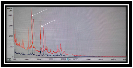 C. gleum. identification using matrix-assisted laser desorption ionization time-of-flight mass spectrometry (MALDI-TOF MS). Red line represents the sample of the child; blue line represents a reference sample (negative control). Each peak in the spectra represents proteins of a specific charge and size. The white arrow indicates the C. gleum.