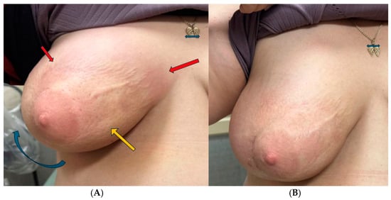 We present a case of RRD involving the breast, characterized by visible shrinking of breast size, generalized induration, erythema, peau d’orange, skin wrinkling, and mild desquamation. The changes occurred 17 weeks from the initiation of pembrolizumab, and nearly five years after completion of radiation therapy. The patient’s contralateral breast showed no clinical changes. On review of previously reported RRD following ICI, we found nine other cases meeting the requisite of new onset symptoms or signs of dermatitis longer than seven days from completion of radiotherapy and longer than one day following the initiation of post-radiotherapy ICI therapy. Cases in which patients received ICIs during radiotherapy were excluded. Including the present patient, ten cases were felt to meet these criteria [