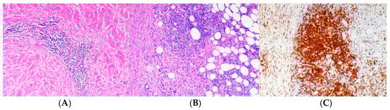 Figure 1A). Biopsy of the breast showed evidence of background chronic dermal fibrosis from prior radiotherapy and new onset perivascular inflammation consisting of a predominant CD5 positive T-lymphocyte infiltration. There was no evidence of active malignancy (
