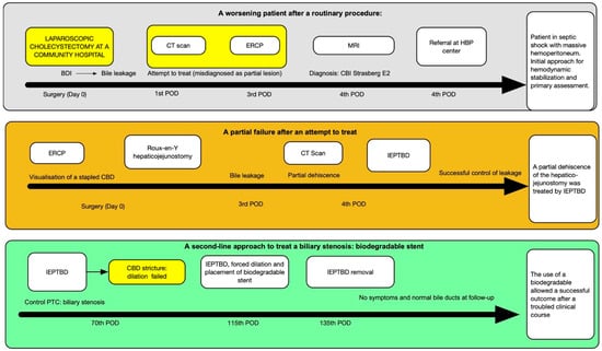 In our case study, we present a 30-year-old man with no significant past medical history referred to our center following a major biliary tract injury (Strasberg E2) due to a laparoscopic cholecystectomy performed at another center. Initially, the injury was misdiagnosed as a minor bile leak, leading to the critical injury being missed for several days. It was only recognized on the fourth postoperative day through an MRI (Figure 1). The patient was then transferred to our HPB center in septic shock and with hemoperitoneum. An ERCP was performed to visualize the injury. The patient urgently underwent surgery. At the laparotomy, no vascular injury was identified, and the hemoperitoneum was attributed to the transection of bile duct vessels. A Roux-en-Y bilioenteric anastomosis was performed, and two abdominal drains were placed. The decision to perform a Roux-en-Y hepaticojejunostomy was made after thorough multidisciplinary evaluation, weighing the risks of delaying the intervention against the necessity for definitive management of the biliary injury. On the third postoperative day, the patient developed a fistula near the surgical suture, suspected clinically and by the increase in bile-like fluid in the drains; this was subsequently confirmed by appropriate imaging studies. After a multidisciplinary evaluation, a percutaneous internal–external hepatic biliary drainage (IEPTBD) was indicated by the interventional radiologist to protect the anastomosis and avoid a second surgical intervention. A close follow-up was initiated during which the fistula resolved. Given the complexity of the biliary injury, a biodegradable stent was chosen for its potential to reduce the need for future interventions and minimize the complications typically associated with traditional stents. The biliary stricture was treated by the interventional radiologist through forced dilation, followed by the insertion of the biodegradable stent. One month later, the percutaneous drainage was successfully removed. The detailed series of treatments is comprehensively depicted in Figure 2.