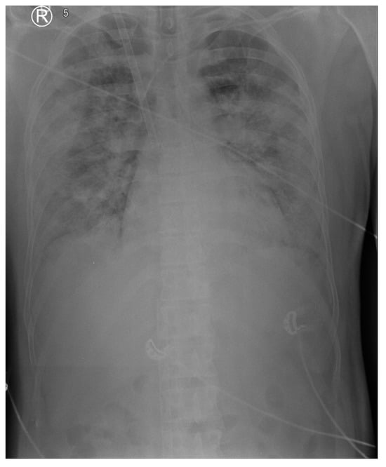 A 44-year-old male patient, with no underlying conditions, was transferred to the tertiary academic hospital from a district hospital due to severe ARDS with an unknown cause. Five days prior to the initial hospital admission, the patient was treated with amoxicillin and azithromycin for suspected bacterial pneumonia in an outpatient clinic. The patient presented to the emergency department (ED) of a district hospital due to breathlessness and was admitted to the local internal medicine ward. Several hours later, due to rapid deterioration, he was transferred to the intensive care unit (ICU) of the district hospital, where he was immediately intubated and mechanical ventilation was initiated. Due to the further deterioration of his condition despite the intensification of treatment, the patient was transferred to the academic hospital on day 2 of his hospital stay.