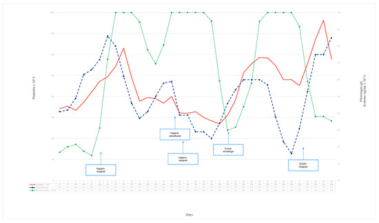 Despite the unaltered oxygenator gas exchange function—PaO2 behind the oxygenator consistently >200 mm Hg—and lack of increase in the oxygenator hemodynamic resistance (constant delta P), an ECMO circuit was replaced on ECLS day 22 in an attempt to correct the systemic coagulation derangement. After the circuit exchange, a rapid improvement in the hemostatic parameters was noted, with a decrease in the D-dimer levels and a fibrinogen increase. However, these parameters returned to the previous trend over the next few days. Simultaneously, the pulmonary bleeding stopped, and the thrombi were finally removed from the airway. The lungs were reaerated and their function gradually recovered. On ECLS day 24, the endotracheal tube was replaced with a size 9 due to the persistent leakage of a size 8.5. Tracheostomy was not performed during the ECMO treatment. ECMO was discontinued on ECLS day 32. The coagulation parameters returned to normal 2 days after the ECMO decannulation (Figure 2). No signs of deep vein thrombosis were detected via ultrasound. The patient was extubated on MV day 39 and discharged to the district hospital 68 days after admission, fully conscious and cooperative, with no apparent neurological deficit. In the two-year follow-up, he was able to return to work.