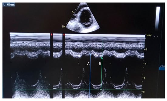 Parasternal M-mode view shows internal dimensions of dilated left ventricle with reduced ejection fraction (EF about 35%). A: End Diastolic Diameter=60 mm; B: End Systolic Diameter=44 mm, Fractional Shortening = 26%).