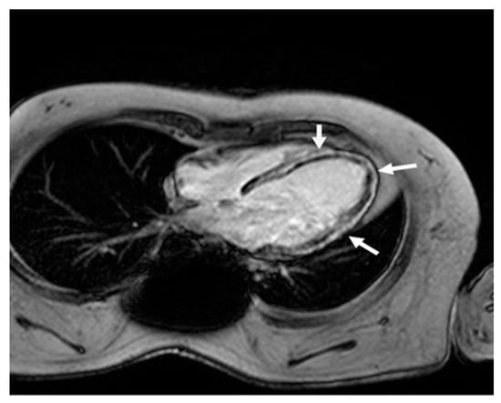 Cardiac magnetic resonance four-chamber view. Late gadolinium enhancement in the left ventricle wall (arrows) in a typical non-ischemic (mid-wall) distribution, due to extensive myocardial fibrosis.