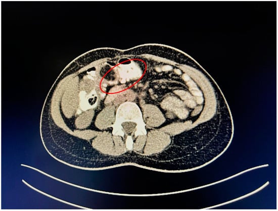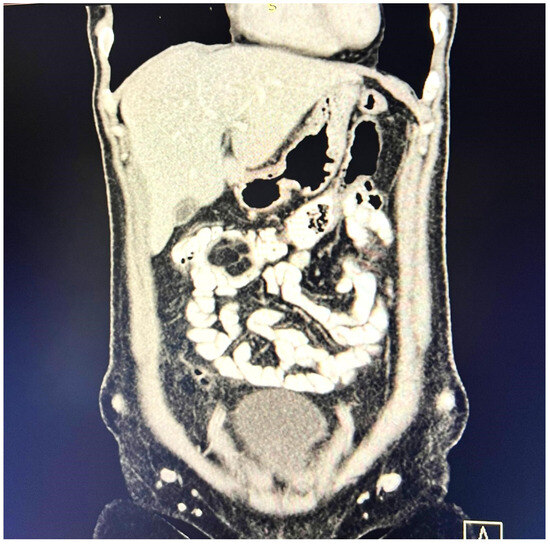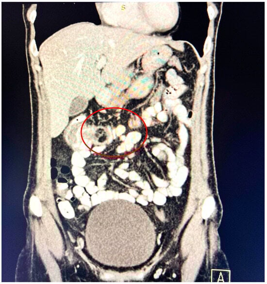 A contrast-enhanced computed tomography (CT) scan conducted on the day of admission revealed circumferential parietal thickening of a maximum of 21 mm at the hepatic flexure of the colon. This thickening extended over a length of approximately 45 mm, resulting in filiform, axial stenosis of the lumen, without any overlying distension of the colonic frame. The parietal thickening was moderately iodophilic and accompanied by discrete linear-type densification of locoregional fat, which was most likely a desmoplastic reaction. A tumor formation with a maximum axial diameter of approximately 29/28 mm, extending craniocaudal on a length of approximately 27 mm, was located at the distal end of the parietal ingrowth with an intraluminal site. This tumor formation had a polycyclic contour, thin septa within, and a discrete lodophilic peripheral appearance. It appeared to have a wide base of implantation at the level of the postero-inferior wall of the colon; mild hepatomegaly in the liver, with a homogeneous structure and a regular surface, and the absence of focal primary or secondary lesions; adenopathies in the hepatic hilum with a maximum diameter of 16/12.5 mm and in the celio-mezenteric territory with a maximum diameter of 24/19 mm; microadenopathies with the gastro-hepatic ligament; and an absence of subdiaphragmatic fluid (Figure 1, Figure 2 and Figure 3).