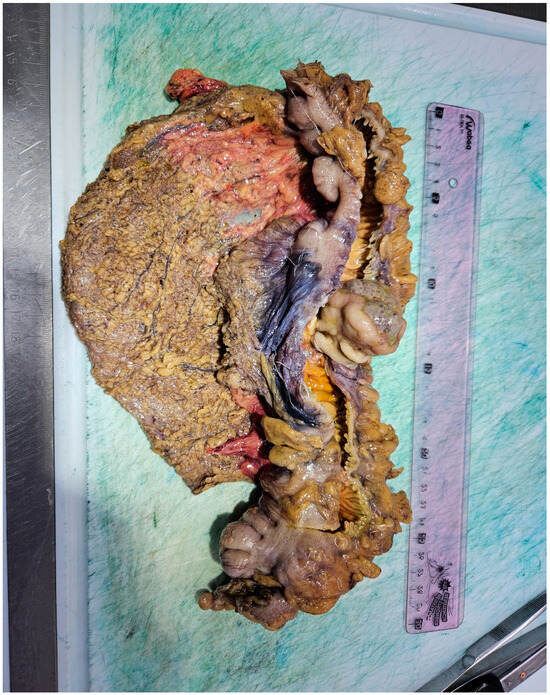 Jiang and colleagues [17] assert that surgical intervention is indicated when the lipoma exceeds 4 cm in size; when the preoperative diagnosis is uncertain; when the lipoma is associated with intussusception and the patient exhibits symptoms; when there is involvement of the muscular or serosal layer; or when the lesion is not suitable to endoscopic resection. The selection of surgical intervention approaches is contingent upon the size and location of the lipoma, as well as the existence of comorbidities. Surgical treatment is required for lipomas exceeding 4 cm in size that cannot be excised endoscopically or in cases of complications such as intestinal obstruction due to intussusception (the most common complication, particularly in the small intestine, though with a low incidence in adults—2–3 cases per 1,000,000 population/year) [18] and intraluminal stenosis caused by the lipoma, mesenteric ischemia, or intestinal necrosis. Various surgical techniques can be employed depending on the location of the lesion, its size, associated complications, the patient’s age and comorbidities, and their clinical–biological status. In cases where intestinal obstruction or an acute complication is excluded, laparoscopic or robot-assisted approaches are preferred [19]. Conversely, in emergency cases or in the absence of minimally invasive services, laparotomy is the preferred approach. If the lesion is relatively accessible and the diagnosis of a giant lipoma is nearly certain—thus excluding the possibility of malignancy—enucleation may be performed either laparoscopically [20] or through open laparotomy. The lesion is identified as a homogenous, well-demarcated, soft, depressible mass located under the serosa or within the colonic wall. A longitudinal incision is made, followed by dissection to separate the serosa from the submucosa. The mass is dissected with minimal impact on the mucosa and muscular layers, and the stalk, if present, is ligated. Hemostasis is achieved through electrocauterization. The procedure is completed with enterorrhaphy using absorbable sutures, ensuring sufficient tension to avoid wound dehiscence but not so much as to create excessive strain on the sutures. A “saline leak” test is performed, followed by the closure of the surgical defect. Alternative surgical techniques are segmental colectomy, hemicolectomy, or total colectomy may be necessary, particularly in cases of intestinal obstruction complicated by significant ischemia and extensive areas of necrosis. Segmental colectomy, as performed in this case, is often recommended when malignancy cannot be excluded based on imaging and biopsy findings. The recurrence of colon lipoma following surgical intervention has not been recorded.