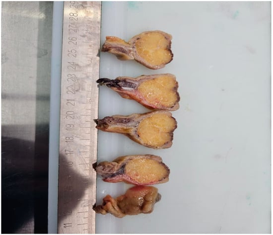 Given the suspicion of malignancy and the clinical presentation, the patient was referred to the surgery department and underwent a right hemicolectomy the following day. Macroscopic examination of the resected specimen revealed a partially ulcerated polypoid tumor measuring 4 × 3 × 3 cm, with a broad implantation base of 2.5 × 2 cm (Figure 6 and Figure 7).