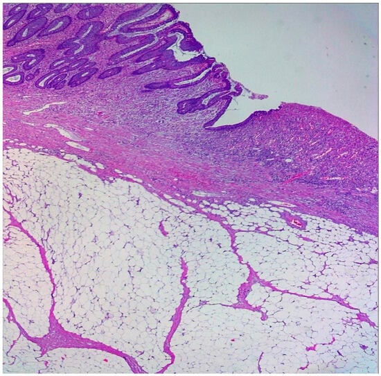 Histopathologic examination confirmed a benign polypoid submucosal lipoma with areas of ulceration and no significant cellular atypia, mitotic figures, or pleomorphism evidence of malignancy (Figure 8). The patient had an uncomplicated postoperative course and was discharged in stable condition one week later.