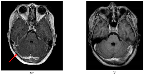 (a) Follow-up contrast-enhanced MR venography at month 4. The red arrow shows partial resolution of thrombosis in the right transverse sinus. (b) Follow-up contrast-enhanced MR venography at month 12 demonstrates complete resolution of the thrombosis.