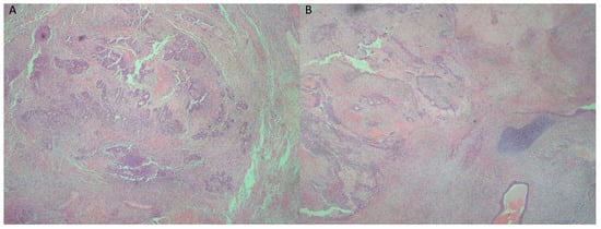 (A) Neoplastic adenoid and solid neuroepithelial formations within immature mesenchyme (hematoxylin–eosin ×40). (B) Neoplastic adenoid and solid neuroepithelial formations within immature mesenchyme, with accompanying presence of islands of mature cartilage (right) (hematoxylin–eosin ×40).