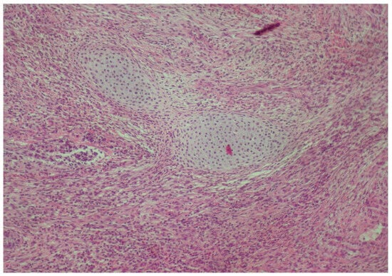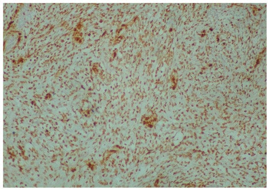 Synovial sarcoma (SS) is another relatively common sarcoma affecting the soft tissues [,]. This lesion accounts for 5% to 10% of soft tissue sarcomas and is most common in the extremities, especially the lower extremities []. Synovial sarcoma of the head and neck area is rare (6–7% of all cases) [,,]. The neck, hypopharynx, and parapharyngeal space are most commonly affected []. In contrast, the oral cavity is rarely affected []. SS affects mostly minors, with a mild male predilection [,]. SS does not arise from true synovial cells but rather from multipotent mesenchymal cells []. Lesions in the head and neck have a worse prognosis than those in other sites []. SS is divided into four categories, with biphasic being the most frequently observed []. The immunohistochemical examination is crucial for differential diagnosis; SS is positive for epithelial markers, such as cytokeratin, epithelial membrane antigen (EMA), as well as vimentin, and is usually negative for CD34 and FLI-1 [].