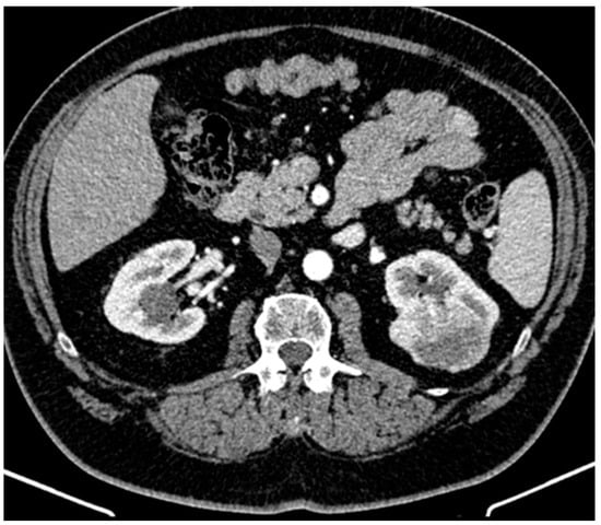 The patient did not meet the criteria for rheumatoid arthritis based on the 2010 ACR/EULAR Rheumatoid Arthritis Classification Criteria given the negative serology for rheumatoid factor and cyclic citrullinated peptide. Other autoimmune diseases were excluded as well. The presence of systemic symptoms (fever and chills), mild leukocytosis, and elevated inflammatory markers in a diabetic with an ICD was highly suggestive of IE and the patient was transferred to the cardiology department of another hospital for further evaluation. The diagnosis of IDCM was confirmed, but the transthoracic (TTE) and transesophageal (TOE) echocardiography did not reveal vegetations. Three separately collected blood samples of 10 mL each were obtained within 24 h, prior to antibiotic initiation, during fever episodes, following strict aseptic and antiseptic protocols. Subsequently, daily blood samples of 10 mL were collected during fever episodes, with antimicrobial-neutralizing agents. All blood cultures were monitored for up to three weeks. Due to the persistence of infectious symptoms, empirical antibiotic therapy was started. To identify a potential infectious collection, a thoracic and abdominal computed tomography (CT) was performed, revealing a mass at the upper pole of the left kidney suggestive for a renal tumor (Figure 1). The patient was referred to the urology department of our hospital. The abdominal magnetic resonance imaging (MRI) confirmed a renal tumor of 6.3 cm diameter, with contrast enhancement and the presence of a “washing out” phenomena.