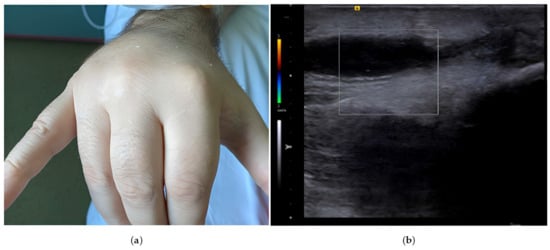 (a) Swelling in the dorsal region of the right hand, with flexion deformities of fingers II–IV and extension of the fifth finger and thumb. (b) Ultrasound examination of the hand showing an anechoic area with no Doppler signal adjacent to the extensor tendons, suggestive of tenosynovitis.