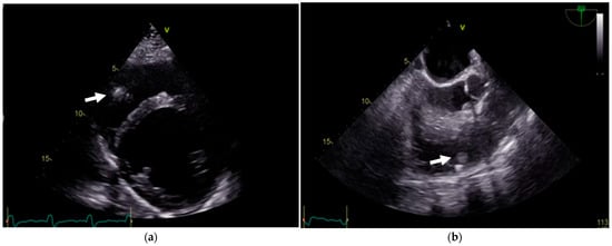 (a) TTE showing a mobile vegetation (arrows) attached to the ICD lead in the right ventricle. (b) TEE confirming two additional vegetations attached to the ICD lead.