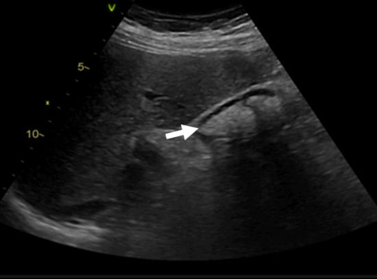 Abdominal ultrasound showing biliary sludge (arrow) associated with ceftriaxone therapy.