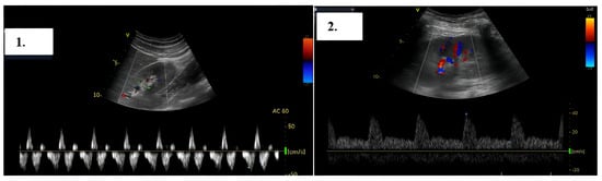 Right intrarenal-venous flow. In the left image 1, discontinuous intrarenal venous flow with S wave < D wave is observed, while in the right image 2, continuous intrarenal venous flow is seen.