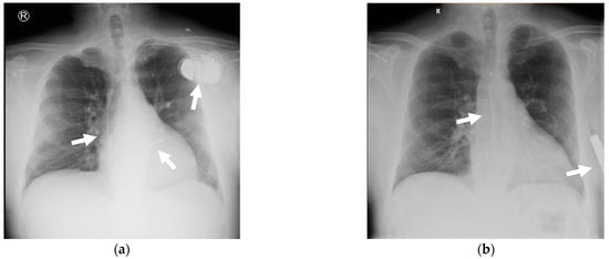 Chest X-ray: (a) on the left side (at admission), a bicameral ICD is visible, with arrows indicating the generator located in the left subclavicular region, the leads situated in the right atrium and right ventricle, respectively. On the right side (b) after S-ICD implantation, the chest X-ray shows arrows indicating the S-ICD electrode and the S-ICD generator.