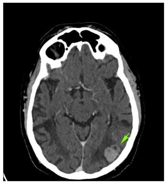 Brain CT scan: left occipital lobe metastases.