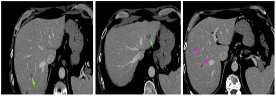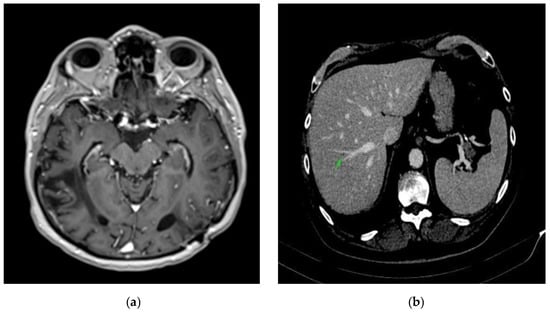 Four weeks after the intervention, the patient complained of blurred vision, headache, and ataxia. The cerebral CT scan showed two lesions: one in the cerebellum (7/7 mm) and another in the occipital lobe (19/9 mm). The multidisciplinary team confirmed that the patient should start whole brain radiation therapy (WBRT) and subsequent treatment for stage IV lung adenocarcinoma. After finishing WBRT, the patient began therapy with pemetrexed—cisplatin q3w for six cycles, which were very well tolerated. He continued pemetrexed maintenance until June 2018, when his CT scan revealed hepatic and left occipital lobe metastases (Figure 2 and Figure 3). The brain metastases were resected, and the patient received immunotherapy—nivolumab 240 mg q2w.