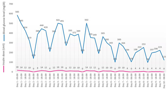 The patient was admitted to the medical oncology clinic and received regular intravenous insulin administration under the supervision of a diabetologist. Blood glucose monitoring was performed four times daily, and the insulin dose was prescribed according to the diabetology consultant’s indications (Figure 4). Other risk factors for developing type I diabetes (excepting Nivolumab treatment and SARS-CoV-2 infection) were ruled out: no former history of autoimmune diseases, no familial history of autoimmune diseases, and no enteroviral infection [6]. Unfortunately, genetic testing was not performed.