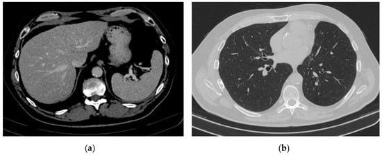 A whole-body CT scan performed in July 2022 (Figure 5a,b) confirmed the complete remission. In November 2022, the brain MRI and the thoracic and abdominal CT scans were within normal limits. The transaminase levels were still 2 times ULN, and the blood glucose levels remained normal.