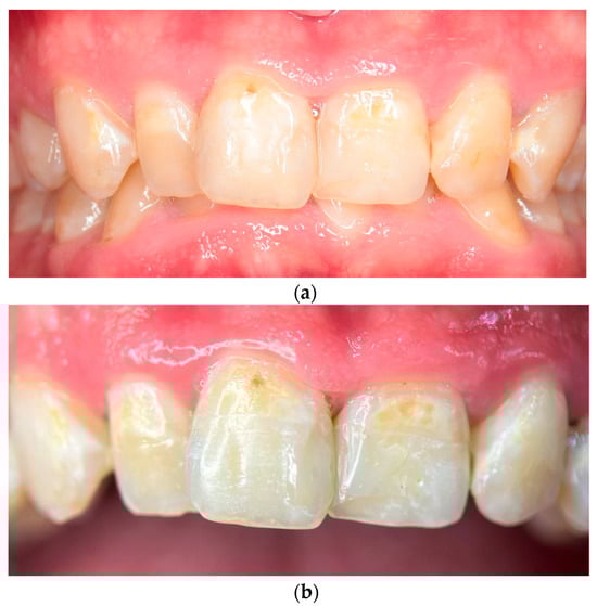 (a) Intraoral photograph at baseline (Day 0) showing extensive demineralization and discoloration affecting all tooth surfaces, particularly the upper anterior teeth. The presence of a deep overbite is also evident, as well as the presence of restorations on teeth 11, 12, 21, and 22. (b) High-resolution photograph of the central incisors at baseline, highlighting severe demineralization and discoloration. The image was captured under dry conditions to enhance visibility of demineralization patterns.