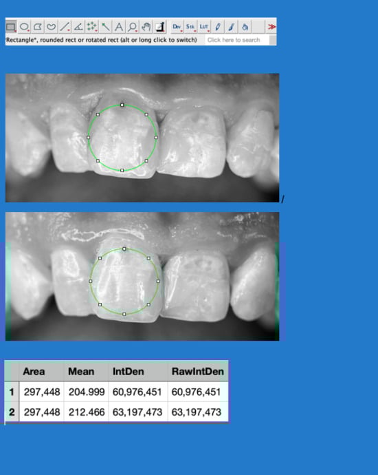 To objectively evaluate changes in enamel mineralization between baseline and follow-up images, a photometric analysis was performed using ImageJ software (version 1.54). Image acquisition was carried out under standardized conditions to ensure data comparability. To eliminate potential interference from color components, images were converted to 8-bit grayscale and subjected to brightness and contrast normalization.