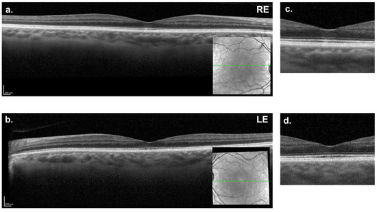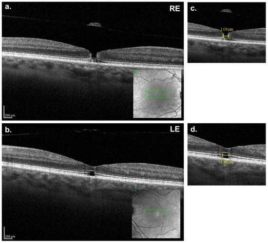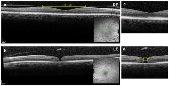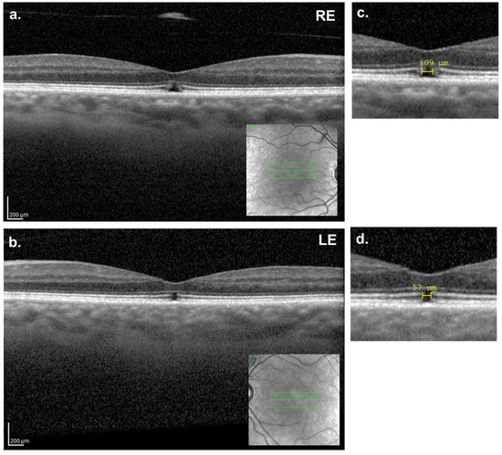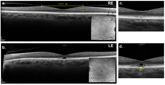 Figure 4. Seven-months follow-up macular OCT. (a,c) Right eye showing the partial closure of the inner retinal layers, with the remaining outer retinal containing a small lamellar hole (109 µm). (b,d) Left eye showing a minimal defect (57 µm) on the outer retinal layers. In the detail images (c,d), there is still a disruption of the photoreceptors’ layers.