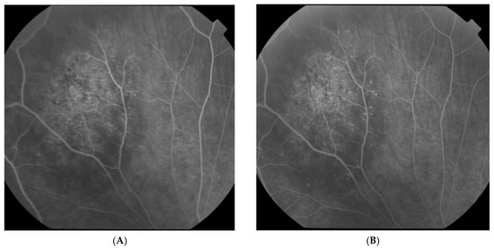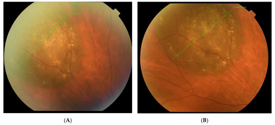 Native photographs of the fundus measuring the diameter of the lesion at the time of diagnosis of the choroidal nevus—11.55 mm, (A) and one year later—11.56 mm (B).
