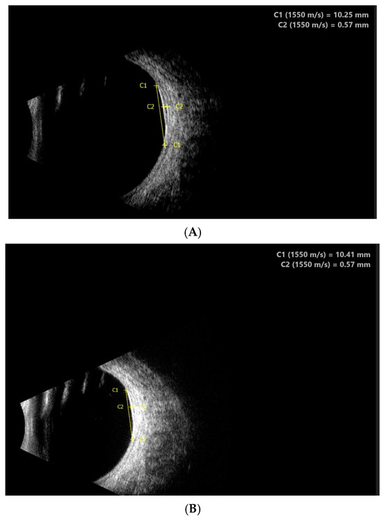 B-ultrasound of the choroidal nevus—at the time of diagnosis (A) and after 1 year (B).