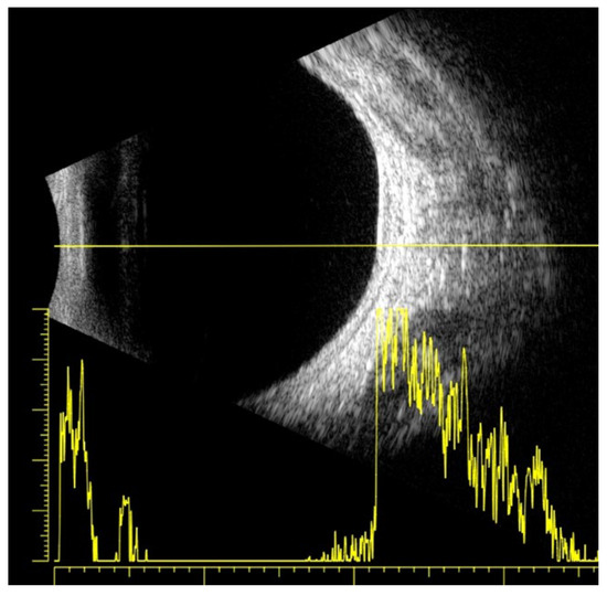 Ultrasound B-scan is essential when documenting and monitoring the growth of intraocular lesions over time. Most choroidal nevi are flat and cannot be detected by ultrasound. A-ultrasound can differentiate the internal structure of the tumor in a differential melanoma diagnosis, which shows low to medium internal ultrasound reflectivity with posterior attenuation, unlike the pigmented nevus, which is characterized by high internal reflectivity out of posterior attenuation (kappa angle = 0). In our patient, the ultrasound revealed a pigmented nevus smaller in size than the diameter measured on the native photographs. The small prominence (0.57 mm), measured by ultrasound, which showed no signs of growth within a year, is considered a benign lesion.