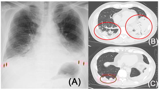 Radiography and computed tomography. (A) Radiography revealed bilateral lower lung field opacities, pleural effusion (arrow), and cardiomegaly. (B) Computed tomography demonstrated bilateral lower lobe consolidations (circle). (C) Computed tomography showed a reduction in bilateral lung opacities and revealed a wedge-shaped opacity (circle) in the right lower lung field.