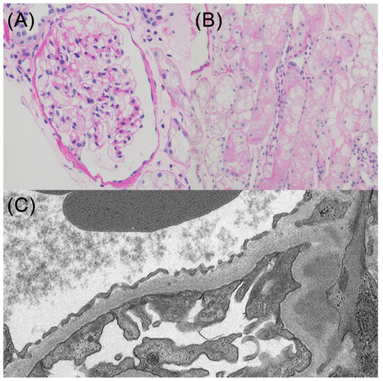 Kidney biopsy (A) The representative glomerulus. There was no evidence of global sclerosis, segmental sclerosis, adhesions, or crescent formation. (B) Swelling and vacuolization were observed in the proximal tubular epithelial cells. (C) Electron microscopy showed extensive foot process effacement without any electron-dense deposits.