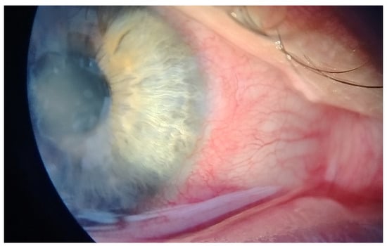 This case report describes a 35-year-old female who presented with redness, pain, tearing, photophobia, and vision loss in her right eye, beginning in mid-September 2024. The patient was a soft contact lens wearer due to myopia of −6.00 DS and reported showering and occasionally sleeping while wearing her contact lenses. She was initially treated for five days with topical corticosteroids and antibiotics by her primary care doctor, with no improvement, after which she was referred to an ophthalmologist. At her initial presentation in October 2024 at the University Hospital Centre Zagreb, the best-corrected visual acuity (BCVA) of the right eye was 0.4 logMAR. Slit-lamp examination revealed pronounced perilimbal injection (Figure 1), two fluorescein-negative stromal infiltrates at the 4 and 8 o’clock positions, and diffusely reduced corneal transparency with a centrally located ring-shaped infiltrate (Figure 2). Perineural infiltrates were also observed (Figure 3).