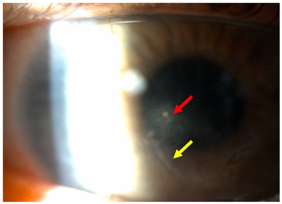 Figure 2. Stromal infiltrate (red arrow) and ring-shaped infiltrate (yellow arrow).