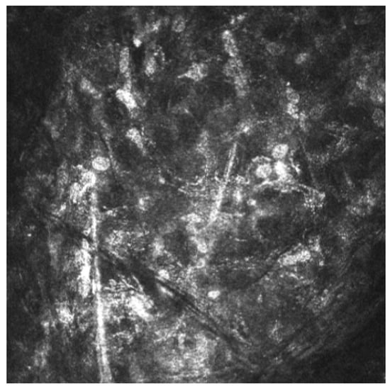 The diagnosis of AK is based on a combination of clinical suspicion, microbiological analysis (smears and cultures), polymerase chain reaction (PCR) and in vivo confocal microscopy (IVCM) [4,9]. IVCM is a noninvasive technique for corneal imaging. It enables visualization of Acanthamoeba cysts, which appear as hyperreflective, double-walled, spherical structures (15–30 µm) located in the epithelium or stroma. Hyperreflective trophozoites, which are significantly larger, are rarely observed [4,10]. The density of cysts and the depth of infiltration have been associated with disease severity [9,11,12,13].