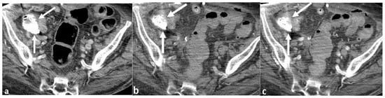 A 72-year-old woman with rectal bleeding. Axial intravenous contrast-enhanced image from single phase CT (a) shows hyperattenuating contents in the cecum (arrows), which was interpreted as active bleeding. Non-IV contrast (b) and arterial phase (c) images from the CT angiogram performed one day later again shows hyperattenuating contents (arrows), similar in volume and distribution to the previous CT scan and without change between the two series, proving that the hyperattenuating material was ingested material rather than intravenous contrast extravasation.