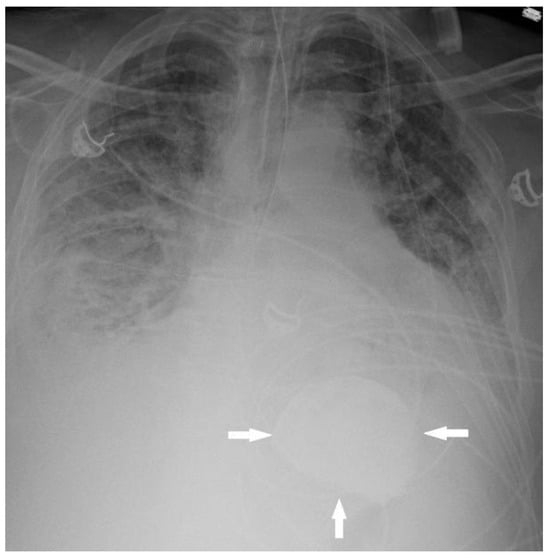A 61-year-old man with shortness of breath. Chest radiograph showing hyperattenuating contents in the lumen of the stomach (arrows). After consultation with the intensive care physician caring for the patient, it was found that the patient was being treated for hyperkalemia with SZC, accounting for this finding.