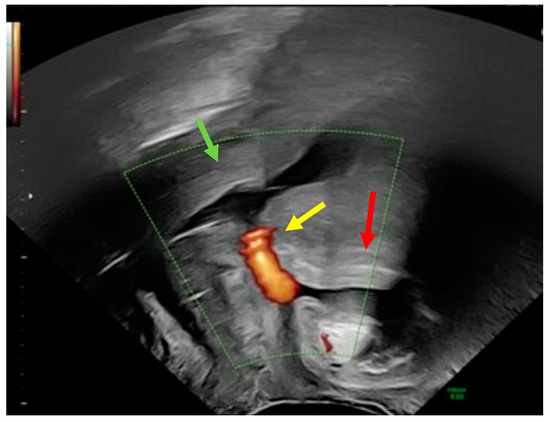 Transvaginal ultrasound using power Doppler demonstrating communication (yellow arrow) between the uterine cervix (green arrow) and bladder (red arrow).
