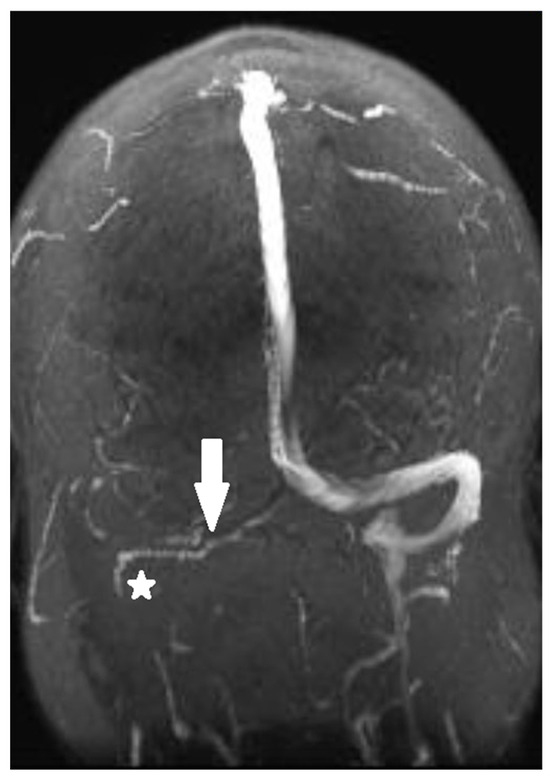 Magnetic resonance venography shows thrombosis of the transverse (arrow) and right sigmoid (asterisk) sinuses.