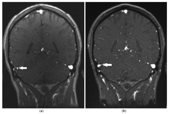 Magnetic resonance venography shows thrombosis of the transverse sinus (a) and its partial recanalization after two months (b) (arrows).