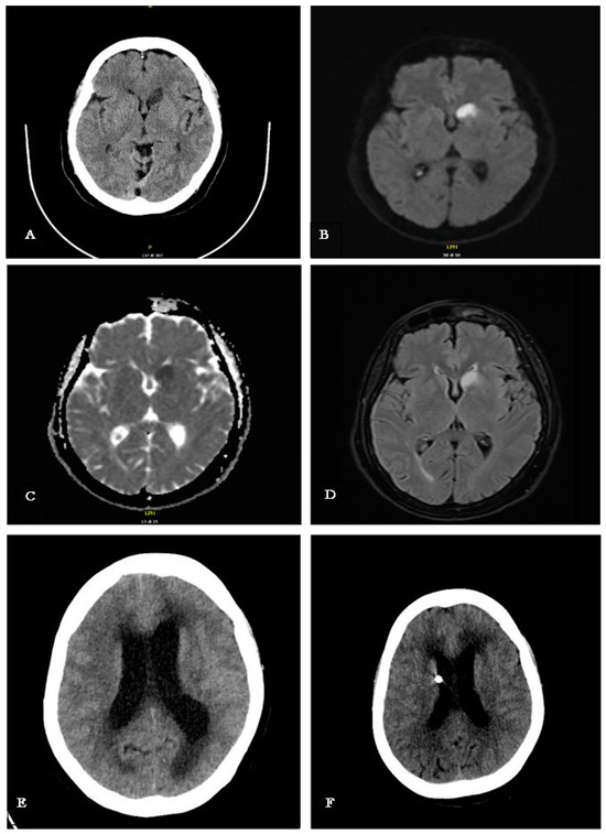 (A) CT scan performed upon arrival in the ED, showing hypodensity in the left caudate nucleus; (B–D) MRI scan (DWI, ADC, FLAIR) performed the day after the patient’s admission in the ED, confirming a subacute ischemia in the left caudate nucleus; the Angio-RM TOF study documented regular flow signal from the major intracranial arterial vessels in the absence of significant dilations/stenosis (these sequences are not shown here); (E) CT scan performed during neurological clinical worsening, with a significant decline in consciousness, showing marked dilation of the ventricular system both supra and infratentorial, along with hypodensity of the subependymal white matter, indicating acute communicating hydrocephalus with transependymal CSF reabsorption; (F) CT scan performed after the insertion of the EDV. This intervention led to a rapid improvement in the patient’s clinical status and a modest reduction in the size of the lateral ventricles.