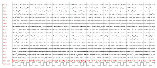 Due to persistent fever, apathy, ideomotor slowing, and clinical features inconsistent with the location of the ischemic lesion, encephalitis was suspected. An electroencephalogram (EEG) revealed frequent localized slow waves in the anterior regions of both hemispheres, supporting the clinical suspicion of meningoencephalitis (Figure 2). A lumbar puncture was subsequently performed, showing clear cerebrospinal fluid (CSF) with a white blood cell count of 744 cells/mm3, predominantly lymphocytic (91%), along with glucose at 2.3 mmol/L, protein at 1659 mg/dL, and lactate at 7.2 mmol/L.
