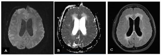 Upon presentation to the emergency room, vital signs, including blood pressure, heart rate, and oxygen saturation, were within normal limits. The patient exhibited fever of 39 °C, and neurological examinations revealed a persistent headache, mild ideomotor slowing, abulia, and multidirectional oscillations during gait and the Romberg test. The rest of her clinical examination was unremarkable, with no observable focal neurological deficits, although a potential language barrier may have constrained the neurological assessment. A computed tomography (CT) of the brain revealed an ischemic lesion on the head of the left caudate nucleus (Figure 1A). Subsequently, Magnetic Resonance Imaging (MRI) confirmed a restricted signal in DWI/ADC corresponding to the lesion site, with hyperintensity in FLAIR sequences indicative of a subacute ischemic lesion (Figure 1B,D). Additionally, there was no alteration in the blood–brain barrier after contrast medium administration, and the Time-of-Flight Magnetic Resonance Angiography study documented regular flow signals from the major intracranial arterial vessels in the absence of significant dilations/stenosis (Figure 1B–D). Accordingly, aspirin was administered for the secondary prevention of ischemic stroke. Comprehensive cardiovascular investigations, including echocardiography and Doppler ultrasonography of the supra-aortic trunks, revealed no abnormalities.