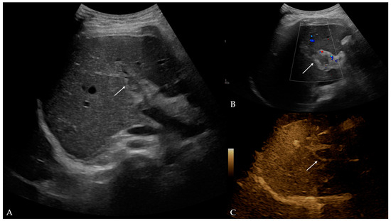 Ultrasound and color Doppler of liver with addition of B-flow option: (A) B-mode—hyperechogenic material in lumen of left portal branch, potentially indicative of thrombus (arrow); (B) color Doppler—no Doppler signal in left portal branch, which corresponds to thrombus (arrow); (C) B-flow—no flow in left portal vein, which confirmed earlier findings (arrow).