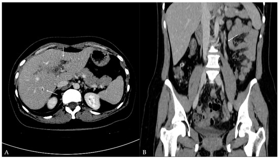 Contrast-enhanced computed tomography of the abdomen and pelvis: (A) axial plane—hypodense filling defects (thrombus) in the left portal vein and additionally in the segmental branch of the right portal vein (arrow); (B) coronal plane—additional hypodense filling defects (thrombus) detected in the inferior mesenteric vein (arrow).