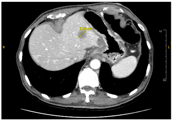Axial CT Abdomen Pelvis with contrast showing a 2.0 cm lesion in the liver consistent with metastasis.
