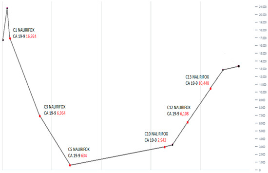 This line graph shows the alterations in serum CA 19-9 levels over the course of treatment with NALIRIFOX. An initial marked decline in CA 19-9 is followed by a gradual and then steep rise, reaching the peak at cycle 13 (C13). This trend demonstrates initial therapeutic response followed by disease progression.