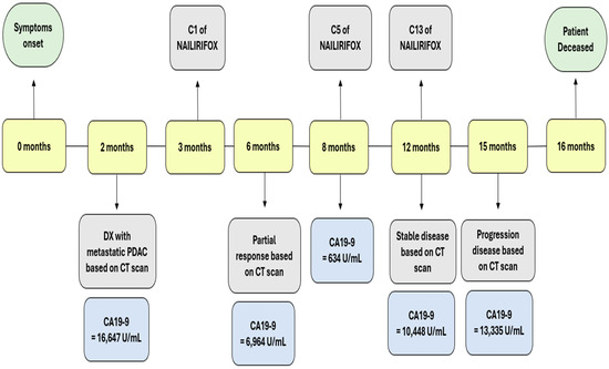 Follow-up CT scans in the following months revealed a mostly stable disease. However, the CA 19-9 levels began to gradually increase as shown in Figure 3. A follow-up CT scan after cycle 13 indicated the progression of the disease (as per RECIST version 1.1). Consequently, the patient was switched to second-line therapy with GEM-NABP after receiving NALIRIFOX for one year. However, treatment was deferred due to the worsening of the patient’s clinical status. Following treatment discontinuation, the patient’s performance rapidly declined after he developed a stroke, despite being on anticoagulants. Following his preference, the patient was referred to hospice care and passed away within the same week. The timeline in Figure 4 shows a detailed description of the patient’s diagnosis and treatment history.