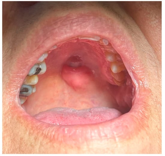 The 61-year-old female patient came to the postgraduate clinic of Oral Medicine and Pathology, Department of Oral Medicine and Pathology, School of Dentistry, Faculty of Health Sciences, Aristotle University of Thessaloniki, Greece and provided written informed consent for the subsequent examination. She complained about the presence of a mass on her palate, which was otherwise asymptomatic, without being able to pinpoint when the tumor initially emerged (Figure 1).